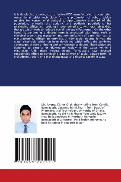 It is developing a novel, cost effective WDT manufacturing process using conventional tablet technology for the production of robust tablets suitable for conventional packaging. Approximately one-third of the population, primarily the geriatric and pediatric populations, has swallowing difficulties, resulting in poor compliance with oral tablet drug therapy which leads to reduced overall therapy effectiveness. On the other hand, Suspension as a dosage form is associated with issues such as microbial growth, sedimentation and non-uniformity of dose, high cost of manufacturing, difficult to carry etc. A new tablet dosage format, the water dispersible tablet has been developed which offers the combined advantages of ease of dosing and convenience of dosing. These tablets are designed to disperse or disintegrate rapidly in the water within 3 minutes.To fulfill these medical needs, formulators have devoted considerable effort to developing a novel type of tablet dosage form for oral administration, one that disintegrates and disperse rapidly in water