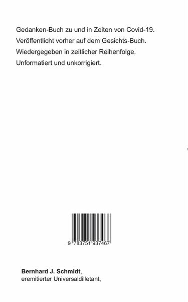 Gedanken-Buch zu und in Zeiten von Covid-19.Veröffentlicht vorher auf dem Gesichts-Buch.Wiedergegeben in zeitlicher Reihenfolge.Unformatiert und unkorrigiert.Um die Vernunft zu bewahren, müssen wir den Glauben an sie verlieren.