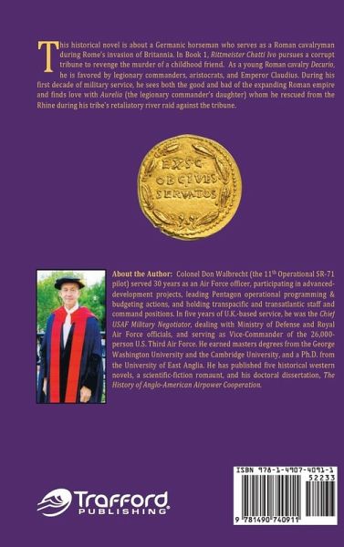 This historical novel is about a handsome young Germanic horseman who served as a Roman auxiliary cavalryman during the early first century when Emperor Claudius’ powerful legions invade the island of Britannia. Driven to revenge the murder of a childhood friend, Chatti Ivo pursues a corrupt Roman tribune across much of Western Europa, to become favored by tribal leaders and Roman aristocrats, including Emperor Claudius himself. During these first 29 years of his life, Ivo sees much of the good and bad of the spectacular young Roman Empire and finds love with Aurelia (the beautiful daughter of Mainz’s Roman legionary commander) whom he rescues from the Rhine during his tribe’s retaliatory raid against the arrogant tribune.