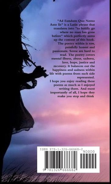 "Ad Eundum Quo Nemo Ante Iit" is a Latin phrase that translates into "to boldly go where no man has gone before" which perfectly sums up the content of this book. The poetry within is raw, painfully honest and passionate. Some are hard to read. The poetry covers mental illness, abuse, sadness, love, hope, justice and recovery. It balances out the happiness and sadness within life with poems from each side represented. I hope you enjoy reading these poems as much as I enjoyed writing them. And most importantly of all, I hope they make you stop and think.