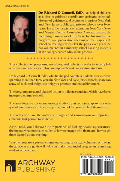 This collection of programs, anecdotes, and reflections seeks to accomplish what may sometimes seem like an impossible task: motivating students. Dr. Richard O'Connell, EdD, who has helped countless students over a career spanning more than forty years in New York and New Jersey schools, shares an array of tools and insights to help you promote student achievement. The programs are actual plans of action to influence students, which have been incorporated into schools. The anecdotes are stories, instances, and advice that you can adapt to your own special circumstances. They are printed in bold so you can find them easily. The reflections are the author's thoughts and ruminations on important concerns that pertain to students. As you read, you'll discover the importance of looking beyond appearances, finding out what motivates students, how to engage with them, and how to get them excited about learning. Whether you are a parent, counselor, teacher, principal, volunteer, or intern, the advice in this guide will help you make meaningful progress in promoting student achievement.