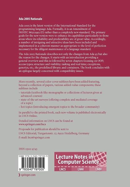 The Ada 2005 Rationale describes not only the changes from Ada 95 but also the reason for the changes. It starts with an introduction providing a general overview and this is followed by seven chapters focusing on OOP; access types; structure and visibility; tasking and real time; exceptions, generics, etc.; the predefined library; and containers. The book concludes with an epilogue largely concerned with compatibility issues.