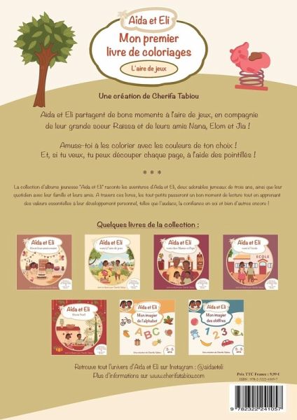 Aïda et Eli partagent de bons moments à l'aire de jeux, en compagnie de leur grande soeur Raïssa et de leurs amis Nana, Elom et Jia !Amuse-toi à les colorier avec les couleurs de ton choix !Et, si tu veux, tu peux découper chaque page, à l'aide des pointillés !***La collection d'albums jeunesse "Aïda et Eli" raconte les aventures d'Aïda et Eli, deux adorables jumeaux de trois ans, ainsi que leur quotidien avec leur famille et leurs amis. A travers ces livres, les tout-petits passeront un bon moment de lecture tout en apprenant des valeurs essentielles à leur développement personnel, telles que l'audace, la confiance en soi et bien d'autres encore !Dans la même collection :1- Aïda et Eli fêtent leur anniversaire2- Aïda et Eli vont à l'aire de jeux3- Aïda et Eli vont chez Mamie et Papi4- Aïda et Eli vont à l'école5- Aïda et Eli fêtent NoëlAïda et Eli - Mon premier livre de coloriages (L'aire de jeux)Aïda et Eli - Mon imagier de l'alphabetAïda et Eli - Mon imagier des chiffresUne journée avec Aïda et Eli (livre cartonné pour les bébés)