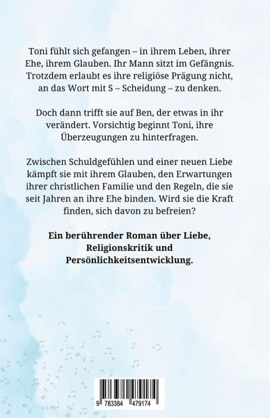 Toni fühlt sich gefangen - in ihrem Leben, ihrer Ehe, ihrem Glauben. Ihr Mann sitzt im Gefängnis. Trotzdem erlaubt es ihre religiöse Prägung nicht, an das Wort mit S - Scheidung - zu denken. Doch dann trifft sie auf Ben, der etwas in ihr verändert. Vorsichtig beginnt Toni, ihre Überzeugungen zu hinterfragen. Zwischen Schuldgefühlen und einer neuen Liebe kämpft sie mit ihrem Glauben, den Erwartungen ihrer christlichen Familie und den Regeln, die sie seit Jahren an ihre Ehe binden. Wird sie die Kraft finden, sich davon zu befreien? Ein berührender Roman über Liebe, Religionskritik und Persönlichkeitsentwicklung.
