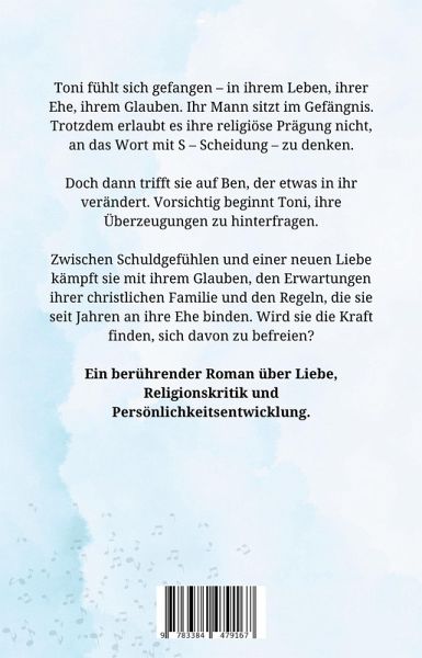 Toni fühlt sich gefangen - in ihrem Leben, ihrer Ehe, ihrem Glauben. Ihr Mann sitzt im Gefängnis. Trotzdem erlaubt es ihre religiöse Prägung nicht, an das Wort mit S - Scheidung - zu denken. Doch dann trifft sie auf Ben, der etwas in ihr verändert. Vorsichtig beginnt Toni, ihre Überzeugungen zu hinterfragen. Zwischen Schuldgefühlen und einer neuen Liebe kämpft sie mit ihrem Glauben, den Erwartungen ihrer christlichen Familie und den Regeln, die sie seit Jahren an ihre Ehe binden. Wird sie die Kraft finden, sich davon zu befreien? Ein berührender Roman über Liebe, Religionskritik und Persönlichkeitsentwicklung.
