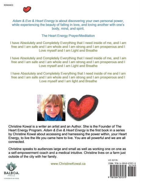 Adam & Eve & Heart Energy is an art book, a story about discovering your own personal power, while experiencing the beauty of falling in love and loving another with one's body, mind, and spirit. My intention in life has always been to do what I love every day and to believe in myself. "We are all powerful beings; absolutely everything you need is inside of you." Each day, I practice making every decision from my heart energy, that piece of God love universe Creator inside of me.