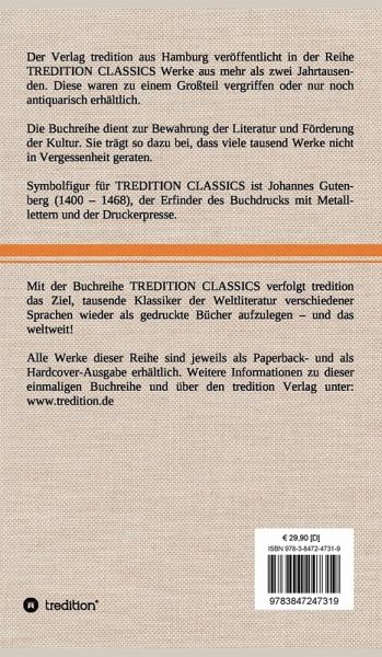 Diese Hardcover-Ausgabe ist Teil der TREDITION CLASSICS. Der Verlag tredition aus Hamburg veröffentlicht in der Buchreihe TREDITION CLASSICS Werke aus mehr als zwei Jahrtausenden. Diese waren zu einem Großteil vergriffen oder nur noch antiquarisch erhältlich. Mit TREDITION CLASSICS verfolgt tredition das Ziel, tausende Klassiker der Weltliteratur verschiedener Sprachen wieder als gedruckte Bücher zu verlegen und das weltweit! Die Buchreihe dient zur Bewahrung der Literatur und Förderung der Kultur. Sie trägt so dazu bei, dass viele tausend Werke nicht in Vergessenheit geraten.