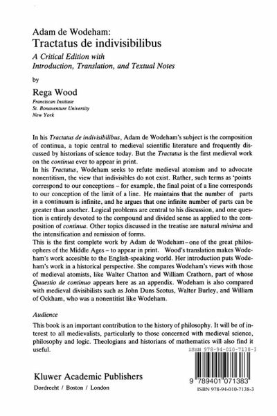 The English Franciscan philosopher and theologian, Adam of Wodeham (d. 1358), was a disciple and friend of William of Ockham; he was also a student of Walther Chatton. Nevertheless, he was an independent thinker who did not hesitate to criticize his former teachers - Ockham sporadically and benevolently, Chatton, frequently and aggressively. Since W odeham developed his own doctrinal position by a thorough critical examination of current opinions, the first part of this introduc tion briefly outlines the positions of the chief figures in the English controversy over indivisibles. The second part of the introduction pre sents a summary of Wodeham's views in the Tractatus de indivisibilibus, lists the contents of the treatise, and considers the question of its date and its chronological position in the context of Wodeham's other works. In the third part, the editorial procedures used here are set forth. 1. THE INDIVISIBILIST CONTROVERSY In the literature of the 13th and 14th centuries, the term 'indivisible' refers to a simple, un extended entity. Consequently, these indivisibles are not physical atoms but either mathematical points, temporal instants or indivisibles of motion, usually called mutata esse. I THOMAS BRADWARDINE (d. 1349), roughly contemporary with Wodeham, classified the positions it was possible to take regarding indivisibles. He described his own view as the common view, that of "Aristotle, A verroes, and most of the moderns," according to which a "continuum was not composed of atoms (athomis) but of parts divisible without end.