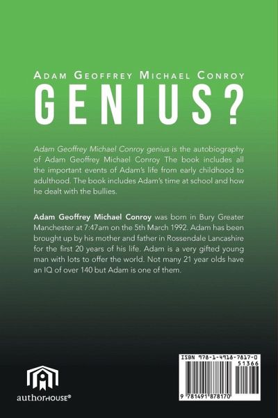Adam Geoffrey Michael Conroy genius is the autobiography of Adam Geoffrey Michael Conroy The book includes all the important events of Adam's life from early childhood to adulthood. The book includes Adam's time at school and how he dealt with the bullies.
