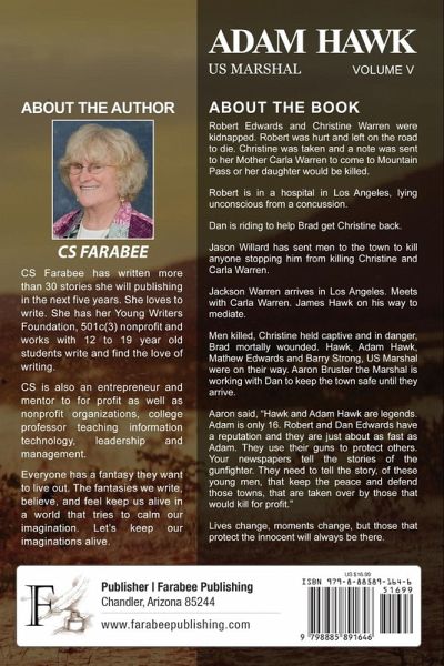 Robert Edwards and Christine Warren were kidnapped. Robert was hurt and left on the road to die. Christine was taken and a note was sent to her Mother Carla Warren to come to Mountain Pass or her daughter would be killed. Robert is in a hospital in Los Angeles, lying unconscious from a concussion. Dan is riding to help Brad get Christine back. Jason Willard has sent men to the town to kill anyone stopping him from killing Christine and Carla Warren. Jackson Warren arrives in Los Angeles. Meets with Carla Warren. James Hawk on his way to mediate. Men killed, Christine held captive and in danger, Brad mortally wounded. Hawk, Adam Hawk, Mathew Edwards and Barry Strong, US Marshal were on their way. Aaron Bruster the Marshal is working with Dan to keep the town safe until they arrive. Aaron said, "Hawk and Adam Hawk are legends. Adam is only 16. Robert and Dan Edwards have a reputation and they are just about as fast as Adam. They use their guns to protect others. Your newspapers tell the stories of the gunfighter. They need to tell the story, of these young men, that keep the peace and defend those towns, that are taken over by those that would kill for profit." Lives change, moments change, but those that protect the innocent will always be there.