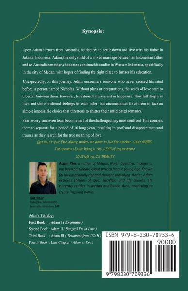 Upon Adam's return from Australia, he decides to settle down and live with his father in Jakarta, Indonesia. Adam, the only child of a mixed marriage between an Indonesian father and an Australian mother, chooses to continue his studies in Western Indonesia, specifically in the city of Medan, with hopes of finding the right place to further his education. Unexpectedly, on this journey, Adam encounters someone who never crossed his mind before, a person named Nicholas. Without plans or preparations, the seeds of love start to blossom between them. However, love doesn't always end in happiness.…mehr