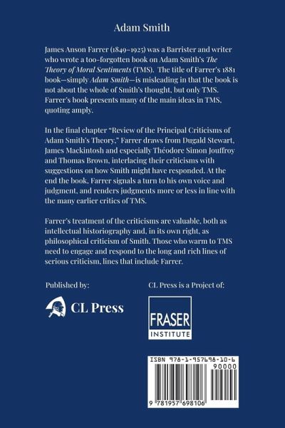 James Anson Farrer (1849-1925) was a Barrister and writer who wrote a too-forgotten book on Adam Smith's The Theory of Moral Sentiments (TMS). The title of Farrer's 1881 book-simply Adam Smith-is misleading in that the book is not about the whole of Smith's thought, but only TMS. Farrer's book presents many of the main ideas in TMS, quoting amply. In the final chapter "Review of the Principal Criticisms of Adam Smith's Theory," Farrer draws from Dugald Stewart, James Mackintosh and especially Théodore Simon Jouffroy and Thomas Brown, interlacing their criticisms with suggestions on how Smith might have responded. At the end the book, Farrer signals a turn to his own voice and judgment, and renders judgments more or less in line with the many earlier critics of TMS. Farrer's treatment of the criticisms are valuable, both as intellectual historiography and, in its own right, as philosophical criticism of Smith. Those who warm to TMS need to engage and respond to the long and rich lines of serious criticism, lines that include Farrer.