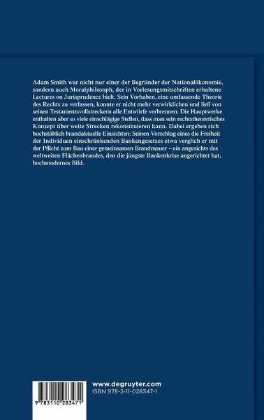 Adam Smith war nicht nur einer der Begründer der Nationalökonomie, sondern auch Moralphilosoph, der in Vorlesungsmitschriften erhaltene Lectures on Jurisprudence hielt. Sein Vorhaben, eine umfassende Theorie des Rechts zu verfassen, konnte er nicht mehr verwirklichen und ließ von seinen Testamentsvollstreckern alle Entwürfe verbrennen. Die Hauptwerke enthalten aber so viele einschlägige Stellen, dass man sein rechtstheoretisches Konzept über weite Strecken rekonstruieren kann. Dabei ergeben sich buchstäblich brandaktuelleEinsichten: Seinen Vorschlag eines die Freiheit der Individuen einschränkenden Bankengesetzes etwa verglich er mit der Pflicht zum Bau einer gemeinsamen Brandmauer - ein angesichts des weltweiten Flächenbrandes, den die jüngste Bankenkrise angerichtet hat, hochmodernes Bild.