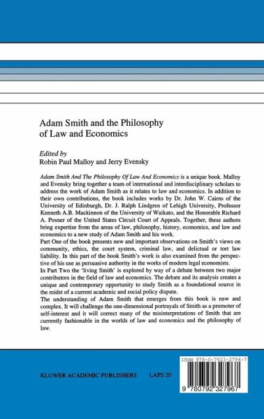 Adam Smith and the Philosophy of Law and Economics is a unique book. Malloy and Evensky bring together a team of international and interdisciplinary scholars to address the work of Adam Smith as it relates to law and economics. In addition to their own contributions, the book includes works by Dr. John W. Cairns of the University of Edinburgh, Dr. J. Ralph Lindgren of Lehigh University, Professor Kenneth A.B. Mackinnon of the University of Waikato, and the Honorable Richard A. Posner of the United States Circuit Court of Appeals. Together these authors bring expertise from the areas of law, philosophy, history, economics, and law and economics to a new study of Adam Smith and his work.