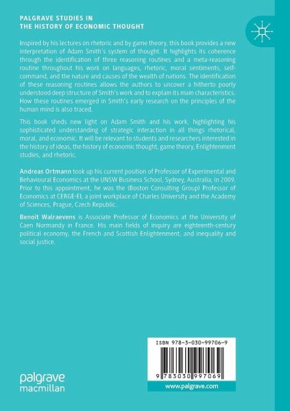 Inspired by his lectures on rhetoric and by game theory, this book provides a new interpretation of Adam Smith's system of thought. It highlights its coherence through the identification of three reasoning routines and a meta-reasoning routine throughout his work on languages, rhetoric, moral sentiments, self-command, and the nature and causes of the wealth of nations. The identification of these reasoning routines allows the authors to uncover a hitherto poorly understood deep structure of Smith's work and to explain its main characteristics. How these routines emerged in Smith's early research on the principles of the human mind is also traced.