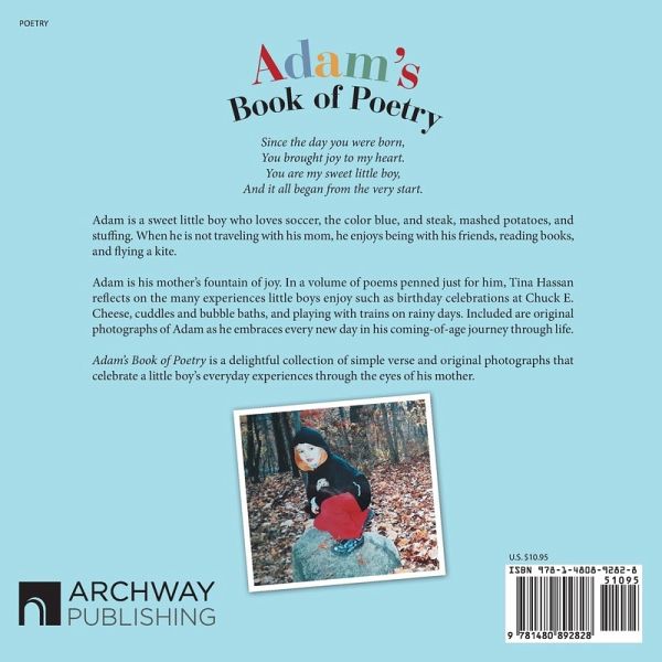 Since the day you were born, You brought joy to my heart. You are my sweet little boy, And it all began from the very start. Adam is a sweet little boy who loves soccer, the color blue, and steak, mashed potatoes, and stuffing. When he is not traveling with his mom, he enjoys being with his friends, reading books, and flying a kite. Adam is his mother's fountain of joy. In a volume of poems penned just for him, Tina Hassan reflects on the many experiences little boys enjoy such as birthday celebrations at Chuck E. Cheese, cuddles and bubble baths, and playing with trains on rainy days. Included are original photographs of Adam as he embraces every new day in his coming-of-age journey through life. Adam's Book of Poetry is a delightful collection of simple verse and original photographs that celebrate a little boy's everyday experiences through the eyes of his mother.