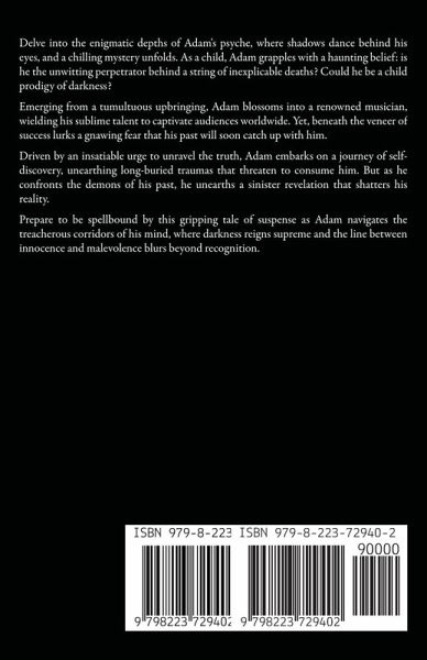 Delve into the enigmatic depths of Adam's psyche, where shadows dance behind his eyes, and a chilling mystery unfolds. As a child, Adam grapples with a haunting belief: is he the unwitting perpetrator behind a string of inexplicable deaths? Could he be a child prodigy of darkness? Emerging from a tumultuous upbringing, Adam blossoms into a renowned musician, wielding his sublime talent to captivate audiences worldwide. Yet, beneath the veneer of success lurks a gnawing fear that his past will soon catch up with him. Driven by an insatiable urge to unravel the truth, Adam embarks on a journey of self-discovery, unearthing long-buried traumas that threaten to consume him. But as he confronts the demons of his past, he unearths a sinister revelation that shatters his reality. Prepare to be spellbound by this gripping tale of suspense as Adam navigates the treacherous corridors of his mind, where darkness reigns supreme and the line between innocence and malevolence blurs beyond recognition.