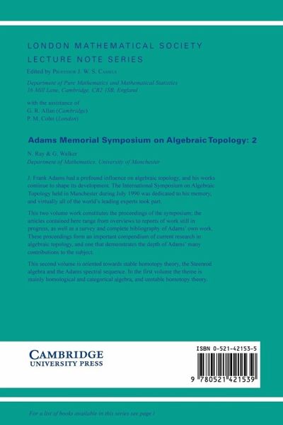 J. Frank Adams had a profound influence on algebraic topology, and his works continue to shape its development. The International Symposium on Algebraic Topology held in Manchester during July 1990 was dedicated to his memory, and virtually all of the world's leading experts took part. This two volume work constitutes the proceedings of the symposium; the articles contained here range from overviews to reports of work still in progress, as well as a survey and complete bibliography of Adams' own work. These proceedings form an important compendium of current research in algebraic topology, and one that demonstrates the depth of Adams' many contributions to the subject. This second volume is oriented towards stable homotopy theory, the Steenrod algebra and the Adams spectral sequence. In the first volume the theme is mainly unstable homotopy theory, homological and categorical algebra.