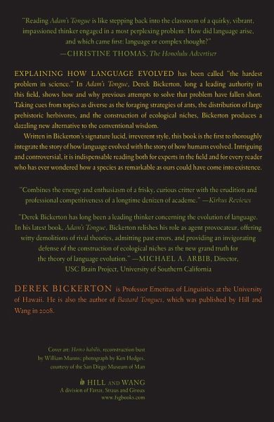 How language evolved has been called "the hardest problem in science." In Adam's Tongue, Derek Bickerton-long a leading authority in this field-shows how and why previous attempts to solve that problem have fallen short. Taking cues from topics as diverse as the foraging strategies of ants, the distribution of large prehistoric herbivores, and the construction of ecological niches, Bickerton produces a dazzling new alternative to the conventional wisdom. Language is unique to humans, but it isn't the only thing that sets us apart from other species-our cognitive powers are qualitatively different. So could there be two separate discontinuities between humans and the rest of nature? No, says Bickerton; he shows how the mere possession of symbolic units-words-automatically opened a new and different cognitive universe, one that yielded novel innovations ranging from barbed arrowheads to the Apollo spacecraft. Written in Bickerton's lucid and irreverent style, this book is the first to thoroughly integrate the story of how language evolved with the story of how humans evolved. Sure to be controversial, it will make indispensable reading both for experts in the field and for every reader who has ever wondered how a species as remarkable as ours could have come into existence.'