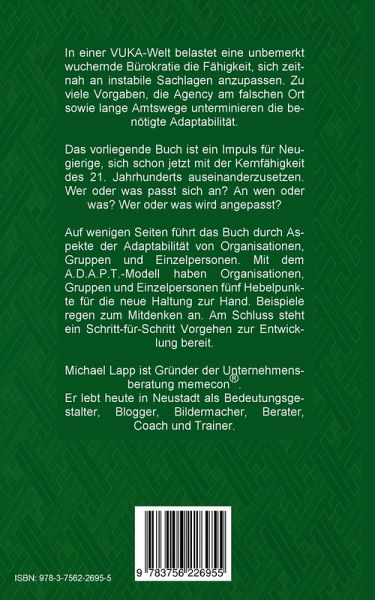 In einer VUKA-Welt belastet eine unbemerkt wuchernde Bürokratie die Fähigkeit, sich zeitnah an instabile Sachlagen anzupassen. Zu viele Vorgaben, die Agency am falschen Ort sowie lange Amtswege unterminieren die benötigte Adaptabilität. Das vorliegende Buch ist ein Impuls für Neugierige, sich schon jetzt mit der Kernfähigkeit des 21. Jahrhunderts auseinanderzusetzen. Wer oder was passt sich an? An wen oder was? Wer oder was wird angepasst?Auf wenigen Seiten führt das Buch durch Aspekte der Adaptabilität von Organisationen, Gruppen und Einzelpersonen. Mit dem A.D.A.P.T.-Modell haben Organisationen, Gruppen und Einzelpersonen fünf Hebelpunkte für die neue Haltung zur Hand. Beispiele regen zum Mitdenken an. Am Schluss steht ein Schritt-für-Schritt Vorgehen zur Entwicklung bereit.