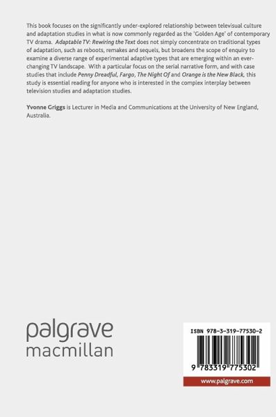 This book focuses on the significantly under-explored relationship between televisual culture and adaptation studies in what is now commonly regarded as the 'Golden Age' of contemporary TV drama. Adaptable TV: Rewiring the Text does not simply concentrate on traditional types of adaptation, such as reboots, remakes and sequels, but broadens the scope of enquiry to examine a diverse range of experimental adaptive types that are emerging within an ever-changing TV landscape. With a particular focus on the serial narrative form, and with case studies that include Penny Dreadful, Fargo, The Night Of and Orange is the New Black, this study is essential reading for anyone who is interested in the complex interplay between television studies and adaptation studies.