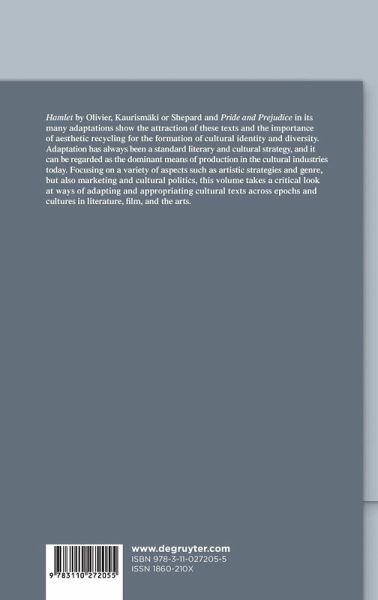 "Hamlet" by Olivier, Kaurismäki or Shepard and "Pride and Prejudice" in its many adaptations show the virulence of these texts and the importance of aesthetic recycling for the formation of cultural identity and diversity. Adaptation has always been a standard literary and cultural strategy, and can be regarded as the dominant means of production in the cultural industries today. Focusing on a variety of aspects such as artistic strategies and genre, but also marketing and cultural politics, this volume takes a critical look at ways of adapting and appropriating cultural texts across epochs and cultures in literature, film and the arts.