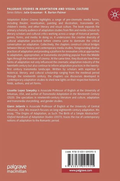 Adaptation Before Cinema highlights a range of pre-cinematic media forms, including theater, novelization, painting and illustration, transmedia art, children's media, and other literary and visual culture. The book expands the primary scholarly audience of adaptation studies from film and media scholars to literary scholars and cultural critics working across a range of historical periods, genres, forms, and media. In doing so, it underscores the creative diversity of cultural adaptation practiced before cinema came to dominate the critical conversation on adaptation. Collectively, the chapters construct critical bridges between literary history and contemporary media studies, foregrounding diverse practices of adaptation and providing a platform for innovative critical approaches to adaptation, appropriation, or transmedia storytelling popular from the Middle Ages through the invention of cinema. At the same time, they illustrate how these forms of adaptation not only influenced the cinematic adaptation industry of the twentieth century but also continue to inform adaptation practices in the twenty-first century transmedia landscape. Written by scholars with expertise in historical, literary, and cultural scholarship ranging from the medieval period through the nineteenth century, the chapters use discourses developed in contemporary adaptation studies to shed new lights on their respective historical fields, authors, and art forms.