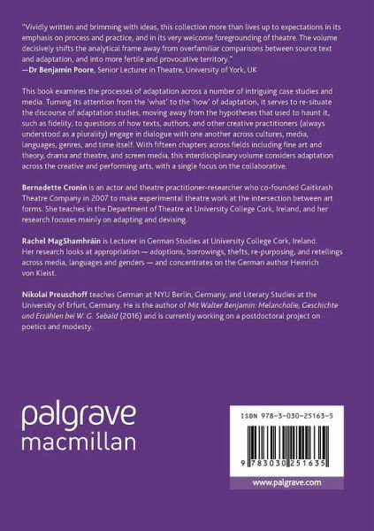 1. Introduction: Process and Practice.- 2. Collaborating with the Dead, or Adapters as Secret Agents.- 3. 'Playing the Maids': Playing with Adaptive Possibilities - Collaboration and the Actor's Process.- 4. The Not-So-Singular Life of Albert Nobbs.- 5. Adaptation, Devising and Collective Creation: Tracing Histories of Pat McCabe's The Butcher Boy on Stage.- 6. The Alien World of Objects: Stanley Kubrick's The Killing.- 7. Adapting History in the Docupoetry of Lorna Dee Cervantes and Script Poems of Danez Smith and Claudia Rankine.- 8. "His world had vanished long before he entered it" Wes Anderson's homage to Stefan Zweig.- 9. Collaborative Art with Political Intent: The 1933 Adaptation of Theodor Storm's Der Schimmelreiter / The Rider on the White Horse (1888).- 10. Adapting Hein's Willenbrock: Andreas Dresen and the legacy of the GDR 'Ensemble' Tradition.- 11. Same Player, Shoot Again: Géla Babluan's 13 (Tzameti), Transnational Auto-Remakes, and Collaboration.- 12. Anselm Kiefer's Signature.- 13. Adaptation as Arguing with the Past: The Case of Sherlock.- 14. The Prestige Noverlisation of the Contemporary TV Series: David Hewson's The Killing.- 15. Things You Can Do to an Author When He's Dead: Literary Prosthetics and the Example of Heinrich von Kleist.- 16. Collaborating with the Dead, Playing the Shakespeare Archive; or How We Can Avoid Being Pushed from Our Stools.