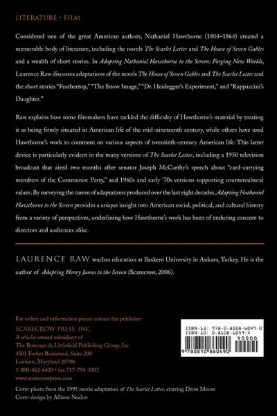 Considered one of the greatest American authors, Nathaniel Hawthorne created a memorable body of literature. In Adapting Nathaniel Hawthorne to the Screen: Forging New Worlds, Laurence Raw demonstrates how filmmakers have turned to Hawthorne to comment on the nation's past, present, and future. From filmmakers who use Hawthorne's material to depict American life of the mid-19th century to those commenting on various aspects of 20th century American life such as the "Red Scare," Raw surveys the canon of adaptations produced over the last eight decades. Raw discusses adaptations of the short stories "Feathertop," "The Snow Image," "Dr. Heidegger's Experiment," and "Rappacinni's Daughter," as well as the novels The House of Seven Gables and The Scarlet Letter, providing unique insight into American history from a variety of perspectives.