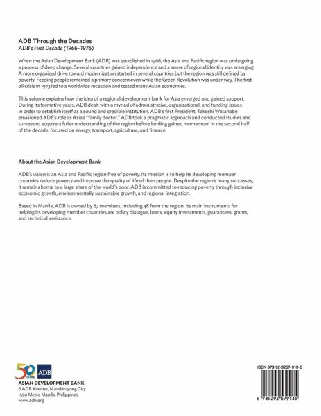The 5-volume publication, ADB through the Decades, provides a historical account of how ADB has evolved to respond to the dynamic changes across the Asia and Pacific region over the past 5 decades. This first volume from the series explains how the idea of a regional development bank for Asia emerged and gained support, and how ADB established itself as a sound and credible institution. When ADB was established in 1966, the Asia and Pacific region was undergoing a process of deep change. Several countries gained independence and a sense of regional identity was emerging. The region was defined by poverty and feeding people remained a primary concern, even while the Green Revolution was under way. The first oil crisis in 1973 tested many Asian economies. This volume explains the beginnings of a regional development bank for Asia. During its formative years, ADB dealt with administrative, organizational, and funding issues to establish itself as a sound and credible institution. ADB's first President, Takeshi Watanabe, envisioned ADB's role as Asia's "family doctor." The Bank conducted several studies to have a fuller understanding of the region before lending on energy, transport, agriculture, and finance gained momentum during the latter half of the first decade.