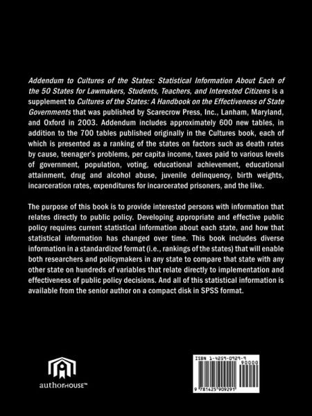Addendum to Cultures of the States: Statistical Information About Each of the 50 States for Lawmakers, Students, Teachers, and Interested Citizens is a supplement to Cultures of the States: A Handbook on the Effectiveness of State Governments that was published by Scarecrow Press, Inc., Lanham, Maryland, and Oxford in 2003. Addendum includes approximately 600 new tables, in addition to the 700 tables published originally in the Cultures book, each of which is presented as a ranking of the states on factors such as death rates by cause, teenager''s problems, per capita income, taxes paid to various levels of government, population, voting, educational achievement, educational attainment, drug and alcohol abuse, juvenile delinquency, birth weights, incarceration rates, expenditures for incarcerated prisoners, and the like. The purpose of this book is to provide interested persons with information that relates directly to public policy. Developing appropriate and effective public policy requires current statistical information about each state, and how that statistical information has changed over time. This book includes diverse information in a standardized format (i.e., rankings of the states) that will enable both researchers and policymakers in any state to compare that state with any other state on hundreds of variables that relate directly to implementation and effectiveness of public policy decisions. And all of this statistical information is available from the senior author on a compact disk in SPSS format.