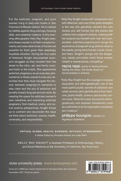 For the addicted, pregnant, and poor women living in daily-rent hotels in San Francisco's Mission district, life is marked by battles against drug cravings, housing debt, and potential violence. In this stunning ethnography Kelly Ray Knight presents these women in all their complex humanity and asks what kinds of futures are possible for them given their seemingly hopeless situation. During her four years of fieldwork Knight documented women's struggles as they traveled from the street to the clinic, jail, and family court, and back to the hotels. She approaches addicted pregnancy as an everyday phenomenon in these women's lives and describes how they must navigate the tension between pregnancy's demands to stay clean and the pull of addiction and poverty toward drug use and sex work. By creating the space for addicted women's own narratives and examining addicted pregnancy from medical, policy, and social science perspectives, Knight forces us to confront and reconsider the ways we think about addiction, trauma, health, criminality, and responsibility.