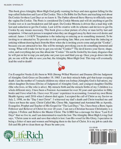 This book gives Almighty Most-High God godly warning for boys and men against falling for the trap called Seduction and Lust of Da Cookie. This is Da Bible for Da Penis and teaching tool about Da Cookie for these Last Days as we know it. The Father allowed Steve Harvey to officially name the vagina Da Cookie. The Penis is considered Da Cookie Monsta and will do anything to get Da Cookie wet so it can breakdown and fall apart. Da Cookie Monsta is driven like a mad dog with lust and seduction to get Da Cookie. Lust will be creative with its schemes and devices to get Da Cookie by any means necessary. This book gives a clear picture of a boy or man led by lust and temptation. 14 but each person is tempted when they are dragged away by their own evil desire and enticed. James 1:14 KJV Temptation is the inducing or enticing as to something immoral; To be inviting to or attracted to; To provoke or risk provoking fate. Men you must bear the inducing or enticing without drawing back from the blow when she is inviting you to come and get dat "Cookie", because you are attracted to her. She will be strongly provoking you to do something immoral and wrong. What will it take for her to get you wit dat "Cookie?" The devil knows your flavor, shape, color, and everything dat you like about dat "Cookie." Do not be fooled by his many disguises that he will put on her to trap you and poke out your eyes and bind you up. Once you go down into the pit, no one will be able to save you but, the Almighty Most-High God. This trap will eventually lead the soul to death!