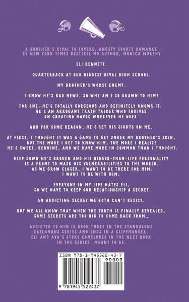 A brother's rival to lovers, angsty sports romance by New York Times bestselling author, Monica Murphy Eli Bennett. Quarterback at our biggest rival high school. My brother's worst enemy. I know he's bad news, so why am I so drawn to him? For one, he's totally gorgeous and definitely knows it. He's an arrogant trash talker who thrives on creating havoc wherever he goes. And for some reason, he's set his sights on me. At first, I thought it was a game to get under my brother's skin, but the more I get to know him, the more I realize he's sweet, genuine, and we have more in common than I thought. Deep down he's broken and his bigger-than-life personality is a front to mask his vulnerabilities to the world. As we grow closer, I want to be there for him. I want to be with him. Everyone in my life hates Eli, so we have to keep our relationship a secret. An addicting secret we both can't resist. But we all know that when the truth is finally revealed, some secrets are too big to come back from... Addicted To Him is book three in the standalone Callahans series and ends in a cliffhanger. Eli and Ava's story concludes in the next book in the series, Meant to Be.