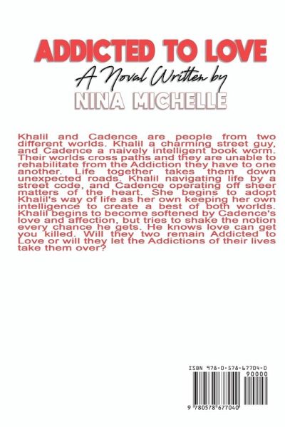 Khalil and Cadence are people from two different worlds. Khalil a charming street guy, and Cadence a naively intelligent book worm. Their worlds cross paths and they are unable to rehabilitate from the Addiction they have to one another. Life together takes them down unexpected roads. Khalil navigating life by a street code, and Cadence operating off sheer matters of the heart. She begins to adopt Khalil's way of life as her own keeping her own intelligence to create a best of both worlds. Khalil begins to become softened by Cadence's love and affection, but tries to shake the notion every chance he gets. He knows love can get you killed. Will they two remain Addicted to Love or will they let the Addictions of their lives take them over?