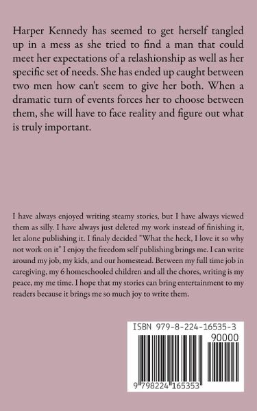 Harper Kennedy has seemed to get herself tangled up in a mess as she tried to find a man that could meet her expectations of a relashionship as well as her specific set of needs. She has ended up caught between two men how can't seem to give her both. When a dramatic turn of events forces her to choose between them, she will have to face reality and figure out what is truly important.