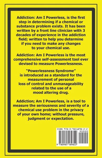 Addiction: Am I Powerless is the first step in determining if a chemical/substance problem really exists. Addiction: Am I Powerless is the most comprehensive self-assessment tool ever devised to measure Powerlessness. This book brings together, for perhaps the first time, a standard for the measurement of Powerlessness via the development of a "Powerlessness Syndrome." It examines the issues of "Loss of Control" and "Unmanageability" as they relate to the use of a mood altering chemical. Addiction: Am I Powerless has been written by a front line clinician with 3 decades of experience in the addiction field; written to help you determine if you need to make any changes to your level of use. It has been created as a tool to personally measure the seriousness and severity of a chemical use problem; in the privacy of your own home. It's the most thorough method available to examine the issue of powerlessness without leaving behind a public health record that might follow you for the rest of your life. It identifies and instructs the reader on what issues to examine and how to examine them. It walks the reader through the discovery process in a heartfelt way but it does not shy away from the serious truth of the matter. It is an objective view of what it means to suffer with the problem many people call addiction. It is the first step towards understanding your own behaviors and freeing yourself from the shame and guilt of substance use.