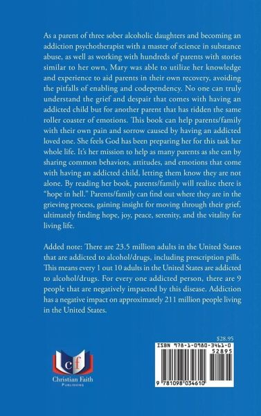 As a parent of three sober alcoholic daughters and becoming an addiction psychotherapist with a master of science in substance abuse, as well as working with hundreds of parents with stories similar to her own, Mary was able to utilize her knowledge and experience to aid parents in their own recovery, avoiding the pitfalls of enabling and codependency. No one can truly understand the grief and despair that comes with having an addicted child but for another parent that has ridden the same roller coaster of emotions. This book can help parents/family with their own pain and sorrow caused by having an addicted loved one. She feels God has been preparing her for this task her whole life. It's her mission to help as many parents as she can by sharing common behaviors, attitudes, and emotions that come with having an addicted child, letting them know they are not alone. By reading her book, parents/family will realize there is "hope in hell." Parents/family can find out where they are in the grieving process, gaining insight for moving through their grief, ultimately finding hope, joy, peace, serenity, and the vitality for living life. Added note: There are 23.5 million adults in the United States that are addicted to alcohol/drugs, including subscription pills. This means every 1 out 10 adults in the United States are addicted to alcohol/drugs. For every one addicted person, there are 9 people that are negatively impacted by this disease. Addiction has a negative impact on approximately 211 million people living in the United States.