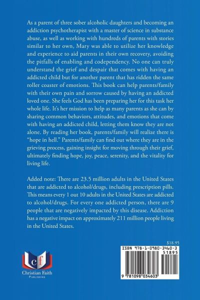 As a parent of three sober alcoholic daughters and becoming an addiction psychotherapist with a master of science in substance abuse, as well as working with hundreds of parents with stories similar to her own, Mary was able to utilize her knowledge and experience to aid parents in their own recovery, avoiding the pitfalls of enabling and codependency. No one can truly understand the grief and despair that comes with having an addicted child but for another parent that has ridden the same roller coaster of emotions. This book can help parents/family with their own pain and sorrow caused by having an addicted loved one. She feels God has been preparing her for this task her whole life. It's her mission to help as many parents as she can by sharing common behaviors, attitudes, and emotions that come with having an addicted child, letting them know they are not alone. By reading her book, parents/family will realize there is "hope in hell." Parents/family can find out where they are in the grieving process, gaining insight for moving through their grief, ultimately finding hope, joy, peace, serenity, and the vitality for living life. Added note: There are 23.5 million adults in the United States that are addicted to alcohol/drugs, including subscription pills. This means every 1 out 10 adults in the United States are addicted to alcohol/drugs. For every one addicted person, there are 9 people that are negatively impacted by this disease. Addiction has a negative impact on approximately 211 million people living in the United States.