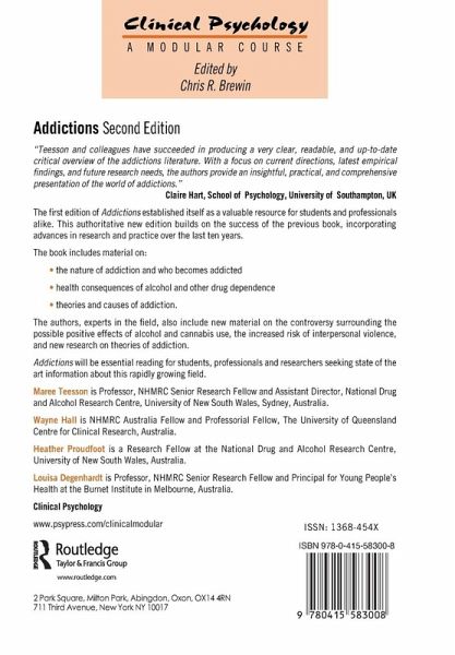 The first edition of Addictions established itself as a valuable resource for students and professionals alike. This authoritative new edition builds on the success of the previous book, incorporating advances in research and practice over the last ten years. The book includes material on: the nature of addiction and who becomes addicted health consequences of alcohol and other drug dependence theories and causes of addiction. The authors, experts in the field, also include new material on the controversy surrounding the possible positive effects of alcohol and cannabis use, the increased risk of interpersonal violence, and new research on theories of addiction. Addictions will be essential reading for students, professionals and researchers seeking state of the art information about this rapidly growing field.