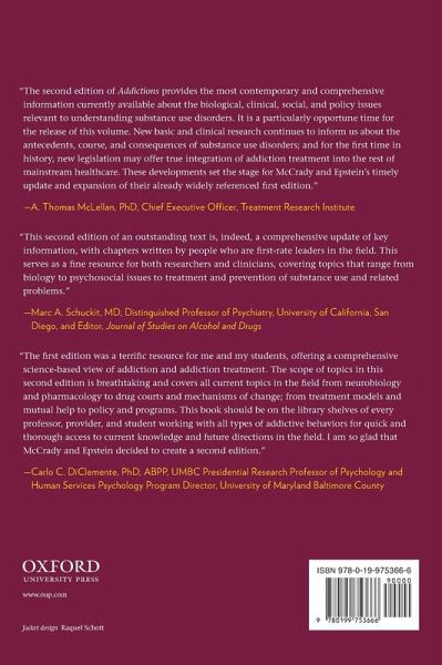 * Acknowledgments * About the Editors * Contributors * Introduction * Barbara McCrady and Elizabeth Epstein * Section I. Overview: Conceptual issues, etiology, epidemiology, and course * * Chapter 1. What is Addiction? * Warren K. Bickel, E. Terry Mueller, and David P. Jarmolowicz * Chapter 2. Neuroscience of Addiction * George F. Koob * Chapter 3. Etiology * Matt McGue and Daniel Irons * Chapter 4. Epidemiology and Diagnosis * Miriam C. Fenton, Christina Aivadyan, and Deborah Hasin * Chapter 5. The Course of Treated and Untreated Substance Use Disorders: Remission and * Resolution, Relapse and Mortality * John W. Finney, Rudolf H. Moos, and Christine Timko * Section II. Specific drugs of abuse: Pharmacological and clinical aspects * * Chapter 6. Alcohol * John J. Woodward * Chapter 7. Sedative-hypnotic and Anxiolytic drugs * Mark A. Oldham and Dominick A. Ciraulo * Chapter 8. Amphetamine-Type Stimulants * Walter Ling, Larissa Mooney, and Richard Rawson * Chapter 9. Cocaine * David A. Gorelick * Chapter 10. Cannabis and Hallucinogens * Robert S. Stephens and Kelsey E. Banes * Chapter 11. Opioids * Susan M. Stine and Thomas R. Kosten * Chapter 12. Nicotine * Raymond Niaura * * Chapter 13. Other Drugs of Abuse: Inhalants, Steroids, and Designer Drugs * Robert J. Pandina, James W. Langenbucher, and Thomas B. Hildebrandt * Section III. Case identification, assessment, and treatment planning * Chapter 14. Evidence-Based Assessment: Strategies and Measures in Addictive Behaviors * Dennis M. Donovan * Chapter 15. Treatment Decision-Making and Goal-Setting * Linda S. Kranitz and Ned L. Cooney * Section IV. Treatment * Chapter 16. Enhancing Motivation for Treatment and Change * Theresa B. Moyers and Lisa H. Glynn * Chapter 17. Cognitive Behavioral Treatment for Addictions * Nadine R. Mastroleo and Peter M. Monti * Chapter 18. Behavioral Treatments * Alan J. Budney, Pamela C. Brown, and Catherine Stanger * Chapter 19. The Disease Model * Valerie J. Slaymaker and Timothy Sheehan * Chapter 20. Couples and Family Treatment Methods * Barbara S. McCrady, Mandy Owens, and Julie Brovko * Chapter 21. Extended Treatment Models * James R. McKay * Chapter 22. Mutual-Help Groups for Alcohol and Other Substance Use Disorders * John Kelly and Julie Yeterian * * Chapter 23. Pharmacotherapies for Alcohol and Drug Use Disorders * Claire Wilcox and Michael Bogenschutz * Chapter 24. Treatment Models for Clients Diverted or Mandated into Drug Treatment * David DeMatteo, Sanjay Shah, Megan Murphy, and Julie Present Koller * Chapter 25. Mechanisms of Behavior Change in Treatment for Alcohol and Other Drug Use Disorders * Richard Longabaugh, Molly Magill, Jon Morgenstern, and Robert Huebner * Chapter 26. Treatment for Substance Use Disorders in the United States: * An Organizational Perspective * Paul M. Roman * * Section V. Practice Issues * * Chapter 27. Legal and Ethical Issues * Cynthia M. A. Geppert * Chapter 28. Interfaces between Substance Use Treatment and Other Health and Social Systems * Susan J. Rose, Allen Zweben, David Ockert, and Armin Baier * Section VI. Issues in Specific Populations * * Chapter 29. Treatment of Persons with Substance Use Disorder and Co-Occurring Other Mental * Disorders * Richard N. Rosenthal * Chapter 30. Treatment for Adolescent Alcohol and Drug Problems * Nicole M. Bekman, Kendall C. Wilkins, and Sandra A. Brown * * Chapter 31. Treatment of Older Adults * Derek D. Satre * * Chapter 32. Ethnic and Cultural Minority Populations * Felipe González Castro, Meghan Garvey, Joshua G. Kellison, and Flavio F. Marsiglia * Chapter 33. Women and Addiction * Elizabeth E. Epstein and David Menges * * Chapter 34. Lesbian, Gay, Bisexual, and Transgender Individuals * Kelly E. Green, Donald A. Bux, and Brian A. Feinstein * * Section VII. Prevention, Policy and Economics of Substance Use Disorders * * Chapter 35. Prevention Aimed at Individuals * Carol W. Metzler, J. Mark Eddy, and David P. Lichtenstein * Chapter 36. Prevention Aimed at the Environment * Andrew J. Treno and Juliet Lee * * Chapter 37. Economic Evaluation of Substance Abuse Interventions: * Overview of Recent Research Findings and Policy Implications * Ioana Popovici and Michael T. French * * Chapter 38. National Policy Issues * Dennis McCarty and Kim A. Hoffman * * Index