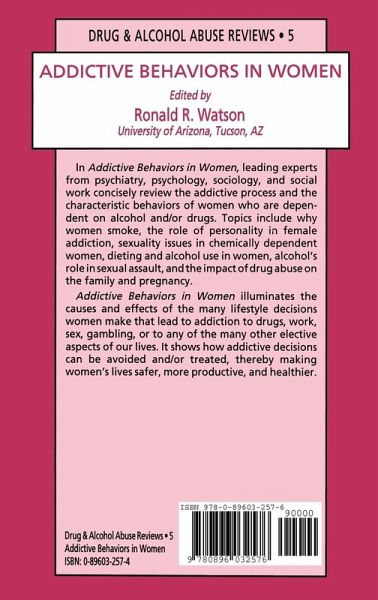 In Addictive Behaviors in Women, leading experts from psychiatry, psychology, sociology, and social work concisely review the addictive process and the characteristic behaviors of women who are dependent on alcohol and/or drugs. Topics include why women smoke, the role of personality in female addiction, sexuality issues in chemically dependent women, dieting and alcohol use in women, alcohol's role in sexual assault, and the impact of drug abuse on the family and pregnancy.