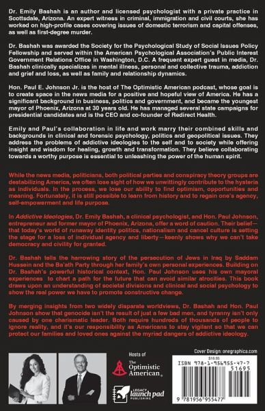 While the news media, politicians, both political parties and conspiracy theory groups are destabilizing America, we often lose sight of how we unwittingly contribute to the hysteria as individuals. In the process, we lose our ability to find optimism, opportunities and meaning. Fortunately, it is still possible to learn from history and to regain one's agency, self-empowerment and life purpose. In Addictive Ideologies, Dr. Emily Bashah, a clinical psychologist, and Paul Johnson, entrepreneur and former mayor of Phoenix, Arizona, offer a word of caution. Their belief-that today's world of runaway identity politics, nationalism and cancel culture is setting the stage for a loss of individual agency and liberty-keenly shows why we can't take democracy and civility for granted. Dr. Bashah tells the harrowing story of the persecution of Jews in Iraq by Saddam Hussein and the Ba'ath Party through her family's own personal experiences. Building on Dr. Bashah's powerful historical context, Paul Johnson uses his own mayoral experiences to chart a path for the future that can avoid similar atrocities. This book draws upon an understanding of societal divisions and clinical and social psychology to show the real power we have to promote constructive change. By merging insights from two widely disparate worldviews, Dr. Bashah and Paul Johnson show that genocide isn't the result of just a few bad men, and tyranny isn't only caused by one charismatic leader. Both require hundreds of thousands of people to ignore reality, and it's our responsibility as Americans to stay vigilant so that we can protect our families and loved ones against the myriad dangers of addictive ideology.