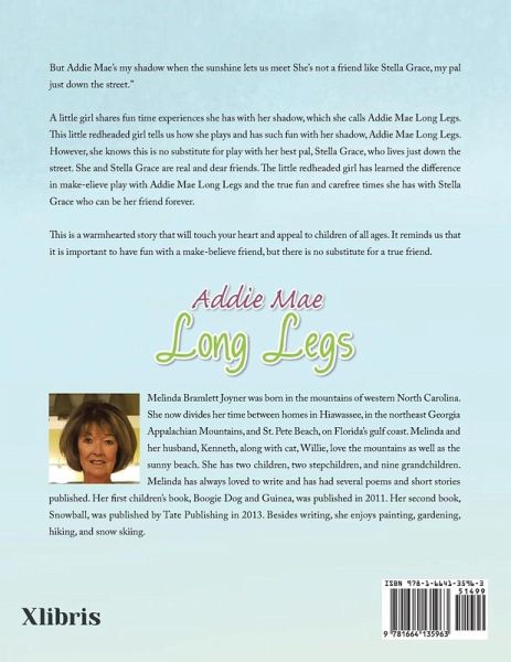 But Addie Mae's my shadow when the sunshine lets us meet She's not a friend like Stella Grace, my pal just down the street." A little girl shares fun time experiences she has with her shadow, which she calls Addie Mae Long Legs. This little redheaded girl tells us how she plays and has such fun with her shadow, Addie Mae Long Legs. However, she knows this is no substitute for play with her best pal, Stella Grace, who lives just down the street. She and Stella Grace are real and dear friends. The little redheaded girl has learned the difference in make-elieve play with Addie Mae Long Legs and the true fun and carefree times she has with Stella Grace who can be her friend forever. This is a warmhearted story that will touch your heart and appeal to children of all ages. It reminds us that it is important to have fun with a make-believe friend, but there is no substitute for a true friend.