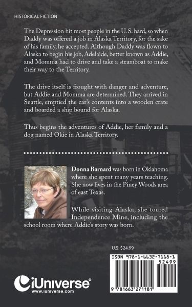 The Depression hit most people in the U. S. hard, so when Daddy was offered a job in Alaska Territory, for the sake of his family, he accepted. Although Daddy was flown to Alaska to begin his job, Adelaide, better known as Addie, and Momma had to drive and take a steamboat to make their way to the Territory. The drive itself is frought with danger and adventure, but Addie and Momma are determined. They arrived in Seattle, emptied the car's contents into a wooden crate and boarded a ship bound for Alaska. Thus begins the adventures of Addie, her family and a dognamed Okie in Alaska Territory.
