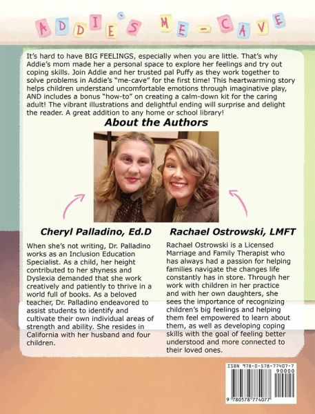 It's hard to have BIG FEELINGS, especially when you are little. That's why Addie's mom made her a personal space to explore her feelings and try out coping skills. Join Addie and her trusted pal Puffy, as they work together to solve problems in Addie's "me-cave". This heartwarming story helps children understand uncomfortable emotions through imaginative play, AND includes a bonus "how-to" create a calm-down area for the caring adult! The vibrant illustrations and delightful ending will surprise and delight the reader. A must-have addition to any home or classroom library!