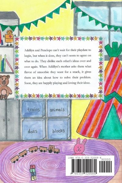 Addilyn and Penelope can't wait for their playdate to begin, but when it does, they can't seem to agree on what to do. They dislike each other's ideas over and over again. When Addilyn's mother asks them what flavor of smoothie they want for a snack, it gives them an idea about how to solve their problem. Soon, they are happily playing and loving their ideas.