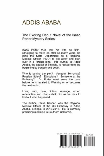 Isaac Porter M.D. lost his wife on 9/11. Struggling to move on after so many years, he joins the State Department as a Regional Medical Officer (RMO) to get away and start over in a foreign land. His journey to Addis Ababa, the capital of Ethiopia, is rocked from the beginning by tragedy and death. Who is behind the plot? Vengeful Terrorists? Russian Spies? Ethiopians? Someone at the Embassy? Dr. Porter must solve the case before he is recalled to Washington or becomes the next victim. Love, truth, hate, fiction, revenge, order, redemption and chaos stalk him as he tries to find out what happened.