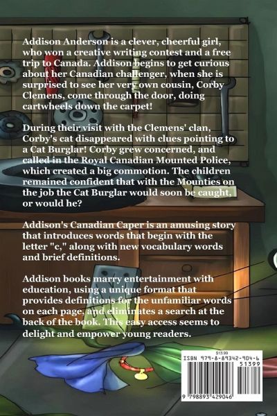 Addison Anderson is a clever, cheerful girl, who is currently studying the castles of other countries. Having won a creative writing contest, and a free trip to Canada, she is curious to meet her Canadian challenger. To Addison's surprise, her very own cousin, Corby Clemens, comes through the door! While the Andersons visit the Clemens' clan, Corby's cat, Clover, disappears! Addison and Corby find clues that point to a Cat Burglar, and Corby's concern for Clover convinces him to call in the Royal Canadian Mounted Police. Corby is confident that with them on the job, the Cat Burglar will soon be caught, or will he? Addison books marry entertainment with education, structured in a unique manner that provides new vocabulary words and brief definitions on each page. With definitions on each page, it eliminates the hunt for unfamiliar word definitions at the back of the book. This new format empowers young readers and allows them to continue reading without timely disruption. Addison stories highlight one letter of the alphabet from beginning to end, with Addison's Canadian Caper highlighting words that begin with the letter "c." While reading these amusing tales, Addison books transport young readers to new locations, introduce other cultures, and share relatable situations.