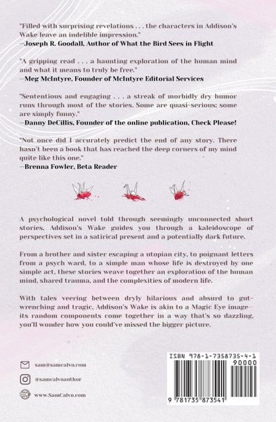 A psychological novel told through seemingly unconnected short stories, Addison's Wake guides you through a kaleidoscope of perspectives set in a satirical present and a potentially dark future. From a brother and sister escaping a utopian city, to poignant letters from a psych ward, to a simple man whose life is destroyed by one simple act, these stories weave together an exploration of the human mind, shared trauma, and the complexities of modern life. With tales veering between dryly hilarious and absurd to gut-wrenching and tragic, Addison's Wake is akin to a Magic Eye image-its random components come together in a way that's so dazzling, you'll wonder how you could've missed the bigger picture.